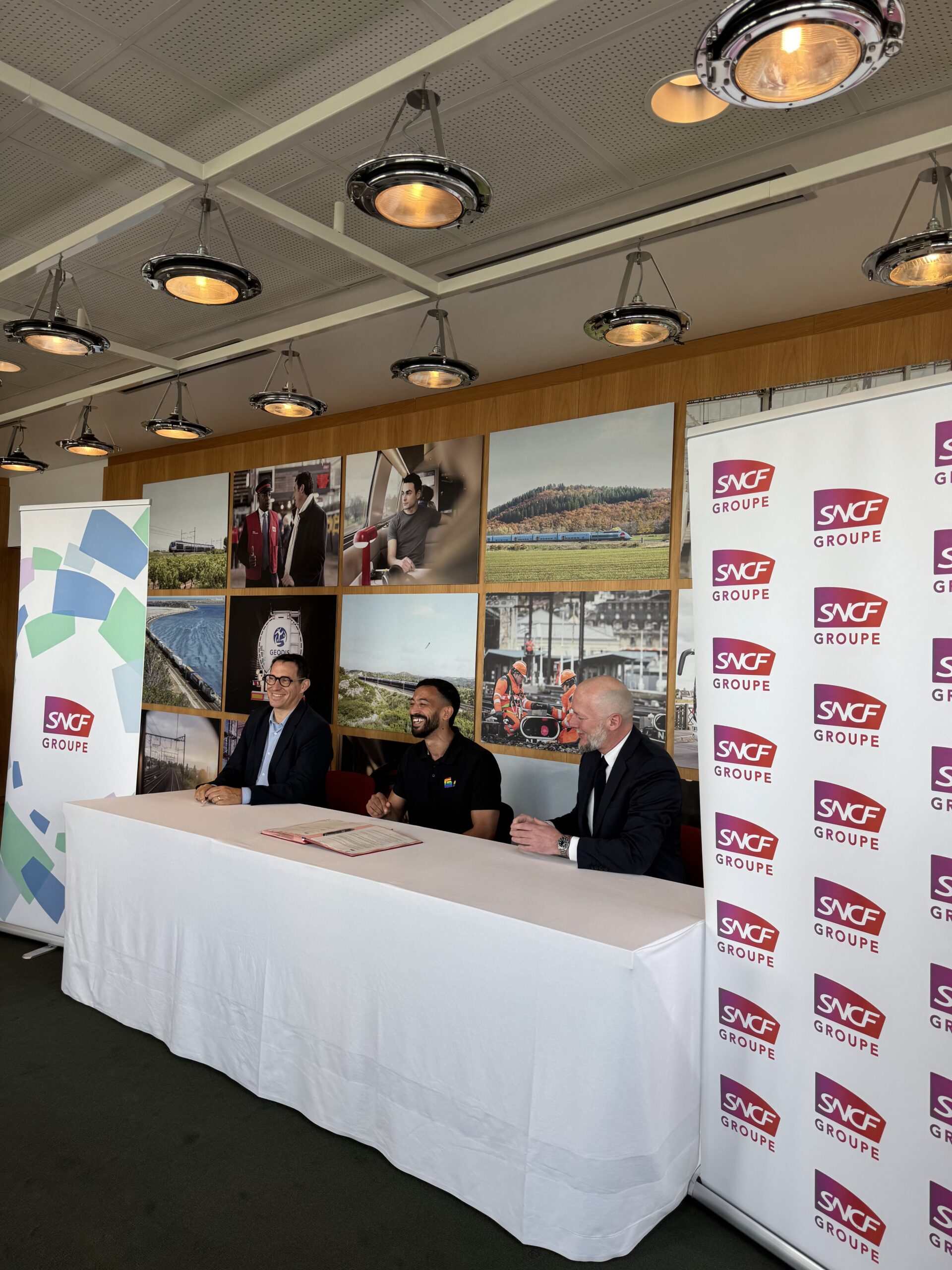 Le lundi 12 mai a dĂ©butĂ© sur les chapeaux de roues pour l’association avec la signature de la nouvelle convention de partenariat entre le Groupe SNCF et l’association GARE!. RĂ©partie entre la direction des ressources humaines et la direction de la communication du Groupe SNCF, cette nouvelle convention acte un renforcement des liens et des moyens allouĂ©s Ă l’association, que ce soit en terme de temps ou d’argent. Ali Louni, prĂ©sident de l’association a ainsi signĂ© la convention avec Phillipe Bru qui reprĂ©sentait la DRH et d’Antoine L’Huillier, directeur de la marque et de l’unitĂ© (pour reprĂ©senter StĂ©phanie Rismont, Directrice de la Communication et de la marque).Â